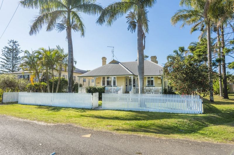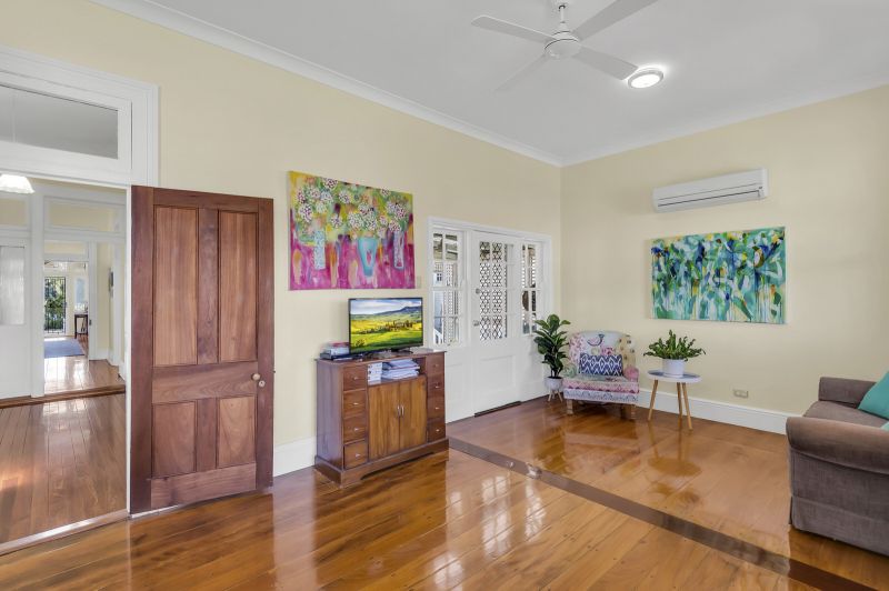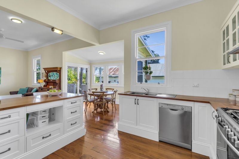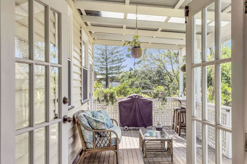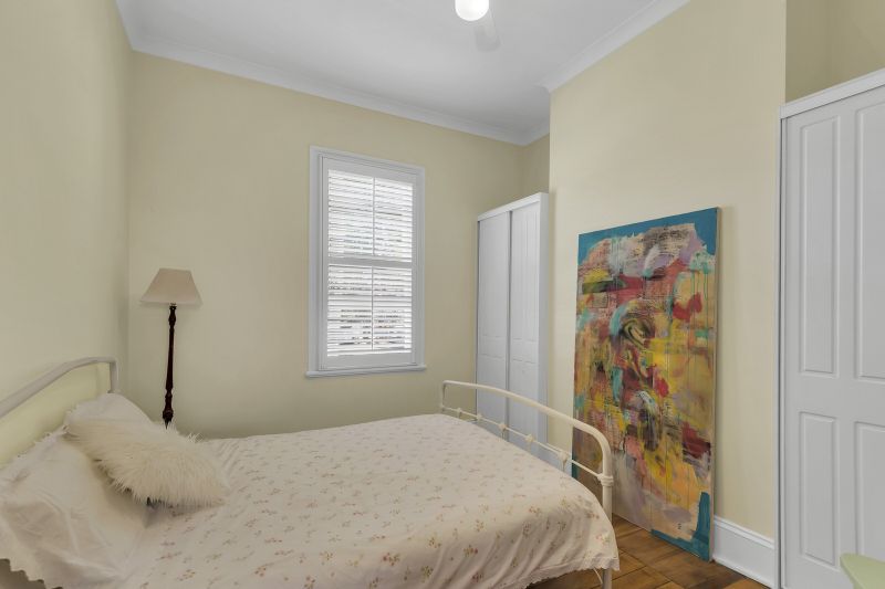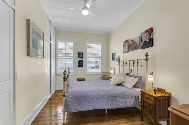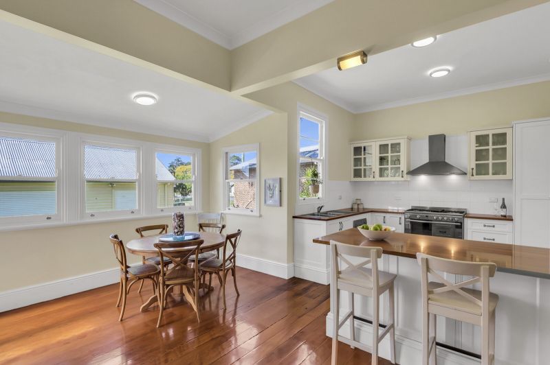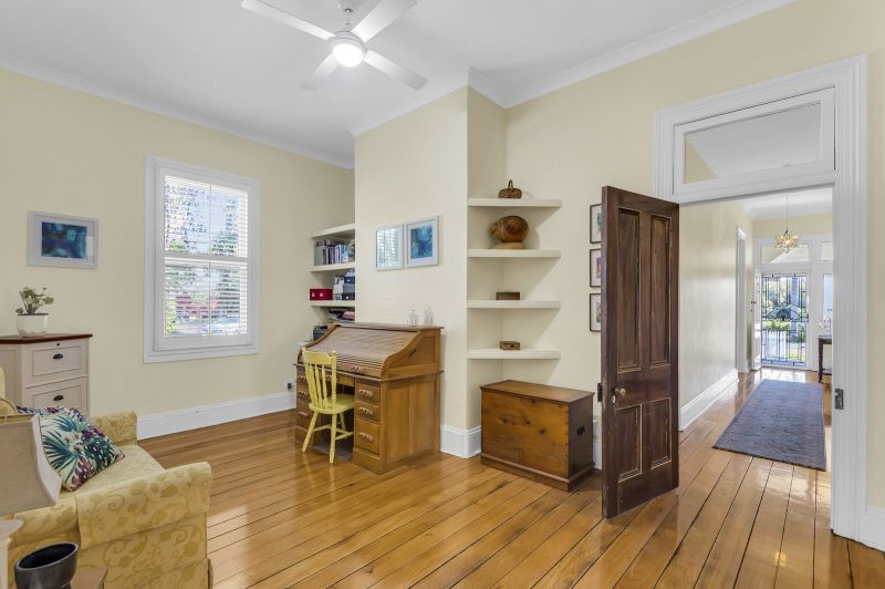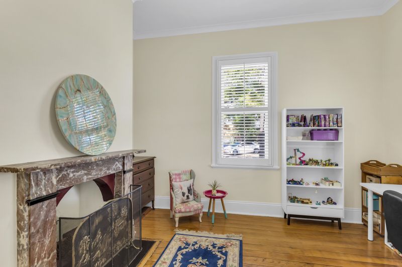 This alluring home features soaring 13-foot ceilings, 4 spacious bedrooms, enormous lounge with floor to ceiling bookshelves, modern kitchen with butcher block timber bench tops and European stainless-steel appliances, 2 bathrooms, study and air-conditioned open plan living/dining leading out to undercover outdoor entertaining area with ducted gas BBQ.