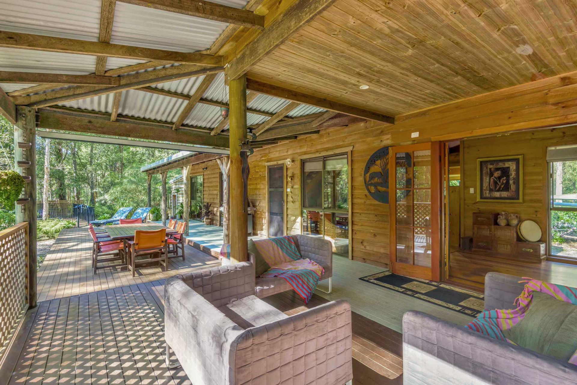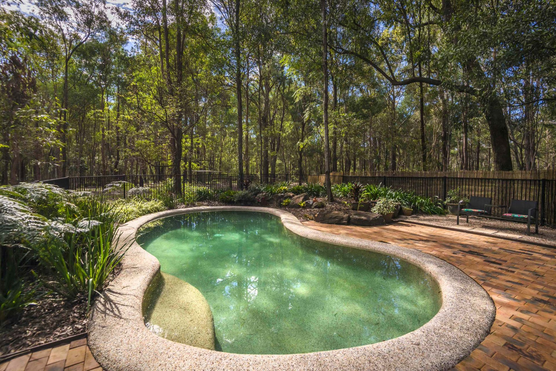 Large outdoor entertaining area overlooks the inground pool, gardens and is surrounded by natural bush.